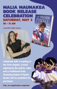 At the Louisville public library. Free and open to the public. Celebrate with a reading of the first chapter, a book signing by the uathor, cake, and a traditional Hula featuring Keaka O Kalani. Books will be available for purchase.